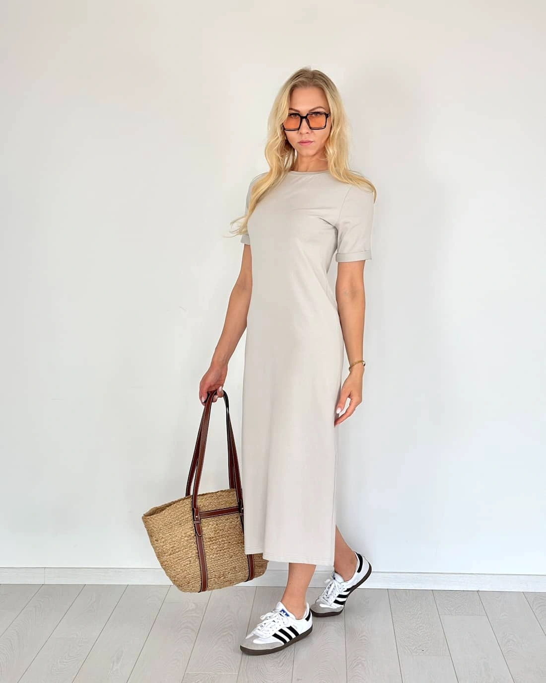 Stilinga moteriška suknelė tavo vasarai! Ši suknelė tai bazinis rūbas, kurį labai lengva derinti su daugeliu drabužių ir įvairia avalyne – nuo basučių iki kedukų. Siūnama iš plono džersio trikotažo, su skeltuku gale kas suteikia elegancijos ir moteriškumo. Ji ypač patogi tavo laisvalaikiui ir kasdienai.